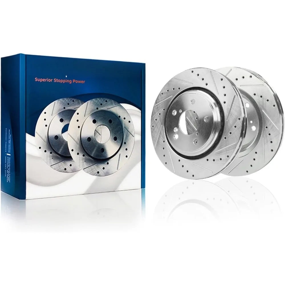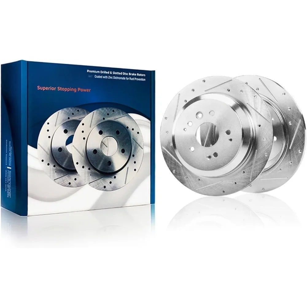 - Enhanced Performance: Drilled and slotted design improves brake cooling, reduces brake fade, and provides consistent braking performance.