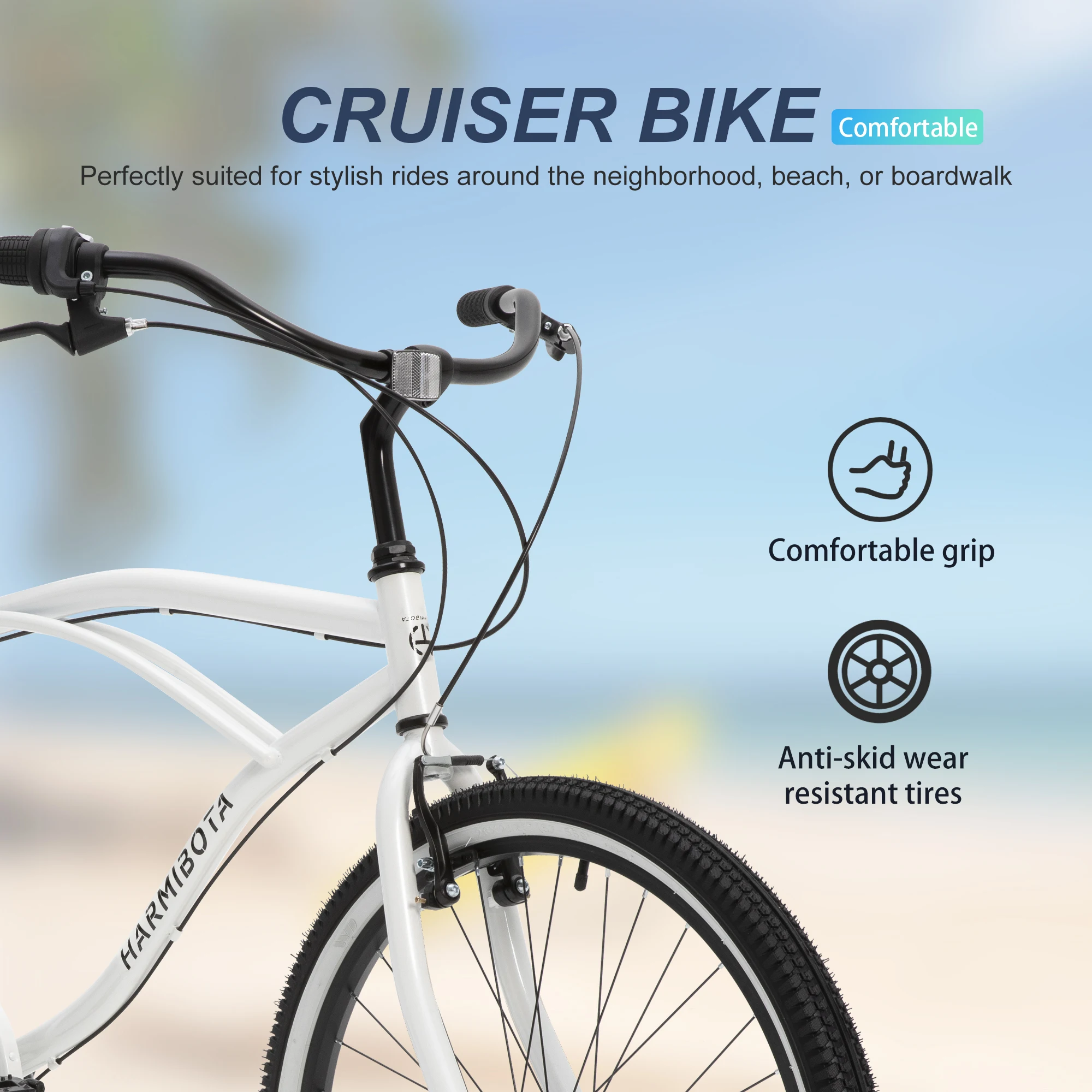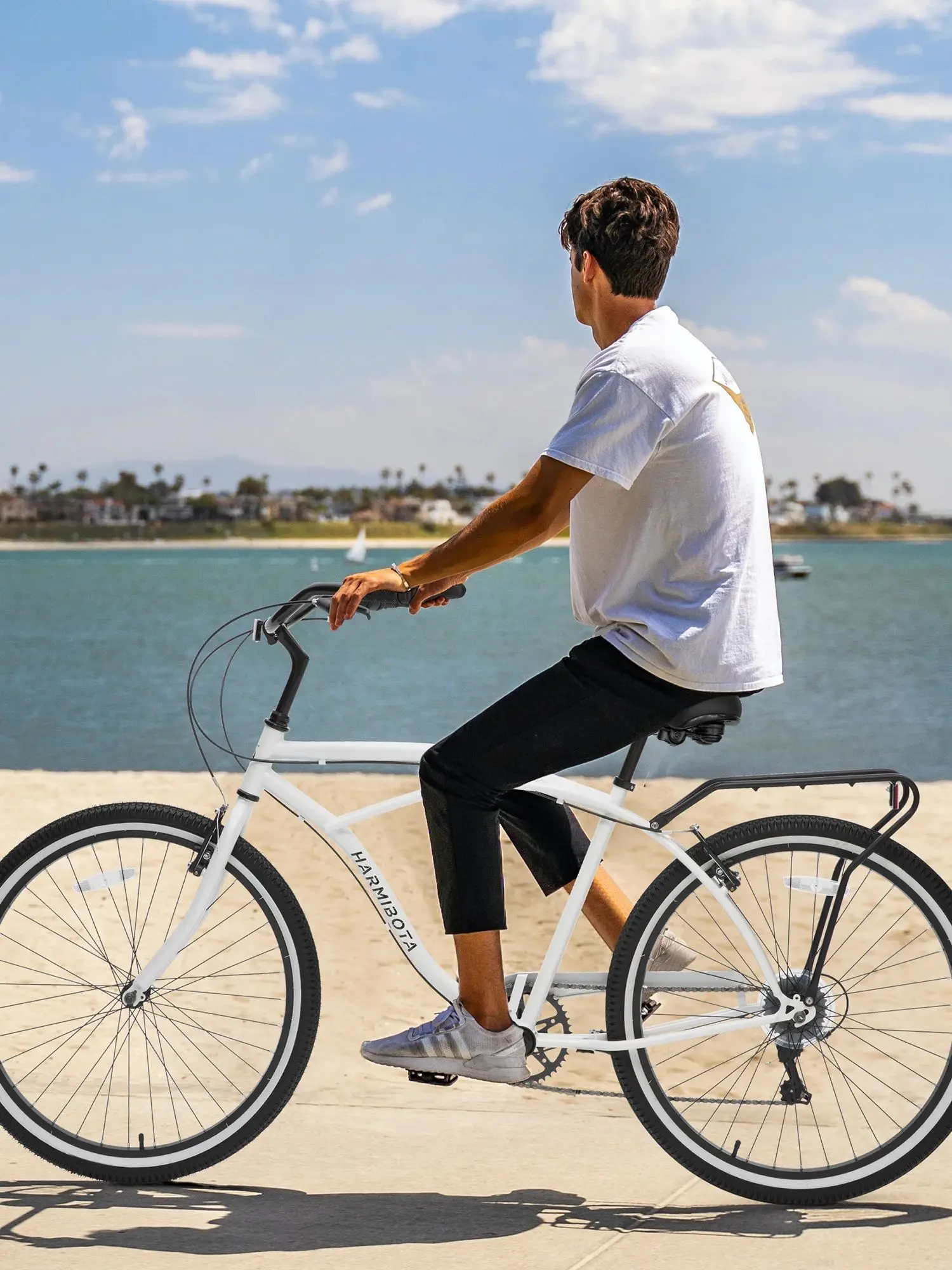 Classic cruiser bike with a sturdy steel frame, perfectly suited for stylish rides around the neighborhood, beach, or boardwalk, 26-inch wheels ideal for riders 5'4" to 6'2" tall