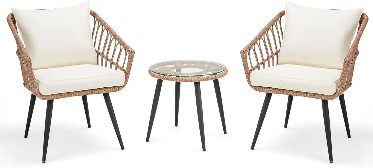 【High-Quality Materials, Enduring Quality】The two chairs of this 3-piece patio furniture are crafted from metal iron pipes and rattan, ensuring durability and sturdiness. The table features a tempered glass top, which is highly resistant to impacts and scratches, promising long-term use in outdoor environments. 【Suitable for Various Scenarios】Thanks to its modern design and meticulous details, this 3-piece set is highly adaptable. It can be used in the living room, or outdoors on balconies, porches and the backyard. Its lightweight build allows for easy repositioning to suit different occasions and seasons. 【Comfortable Backrest and Cushions】Ergonomically designed, our 3-piece patio furniture set offers enhanced comfort. The cushions and backrests are crafted to maximize your comfort and relaxation, perfect for enjoying drinks while unwinding. 【Adjustable Feet】Our chairs feature a highly user-friendly design. Each leg is equipped with an adjustment knob, enabling you to fine-tune it according to the ground conditions and maintain the chair's balance. 【Assembly Instructions】This patio chair set includes 2 seats and 1 coffee table. The chair is 32" high, 26" wide, 22" deep, the coffee table is 20" high with a 20" diameter. It's easy to assemble We offer detailed instructions and all needed hardware. Our customer service team is ready to assist if you have any questions during assembly. 【High-Quality Materials, Enduring Quality】The two chairs of this 3-piece patio furniture are crafted from metal iron pipes and rattan, ensuring durability and sturdiness. The table features a tempered glass top, which is highly resistant to impacts and scratches, promising long-term use in outdoor environments. 【Suitable for Various Scenarios】Thanks to its modern design and meticulous details, this 3-piece set is highly adaptable. It can be used in the living room, or outdoors on balconies, porches and the backyard. Its lightweight build allows for easy repositioning to suit different occasions and seasons. 【Comfortable Backrest and Cushions】Ergonomically designed, our 3-piece patio furniture set offers enhanced comfort. The cushions and backrests are crafted to maximize your comfort and relaxation, perfect for enjoying drinks while unwinding. 【Adjustable Feet】Our chairs feature a highly user-friendly design. Each leg is equipped with an adjustment knob, enabling you to fine-tune it according to the ground conditions and maintain the chair's balance. 【Assembly Instructions】This patio chair set includes 2 seats and 1 coffee table. The chair is 32" high, 26" wide, 22" deep, the coffee table is 20" high with a 20" diameter. It's easy to assemble We offer detailed instructions and all needed hardware. Our customer service team is ready to assist if you have any questions during assembly.