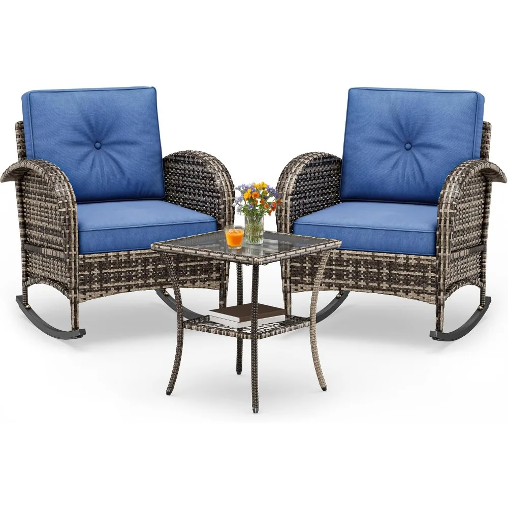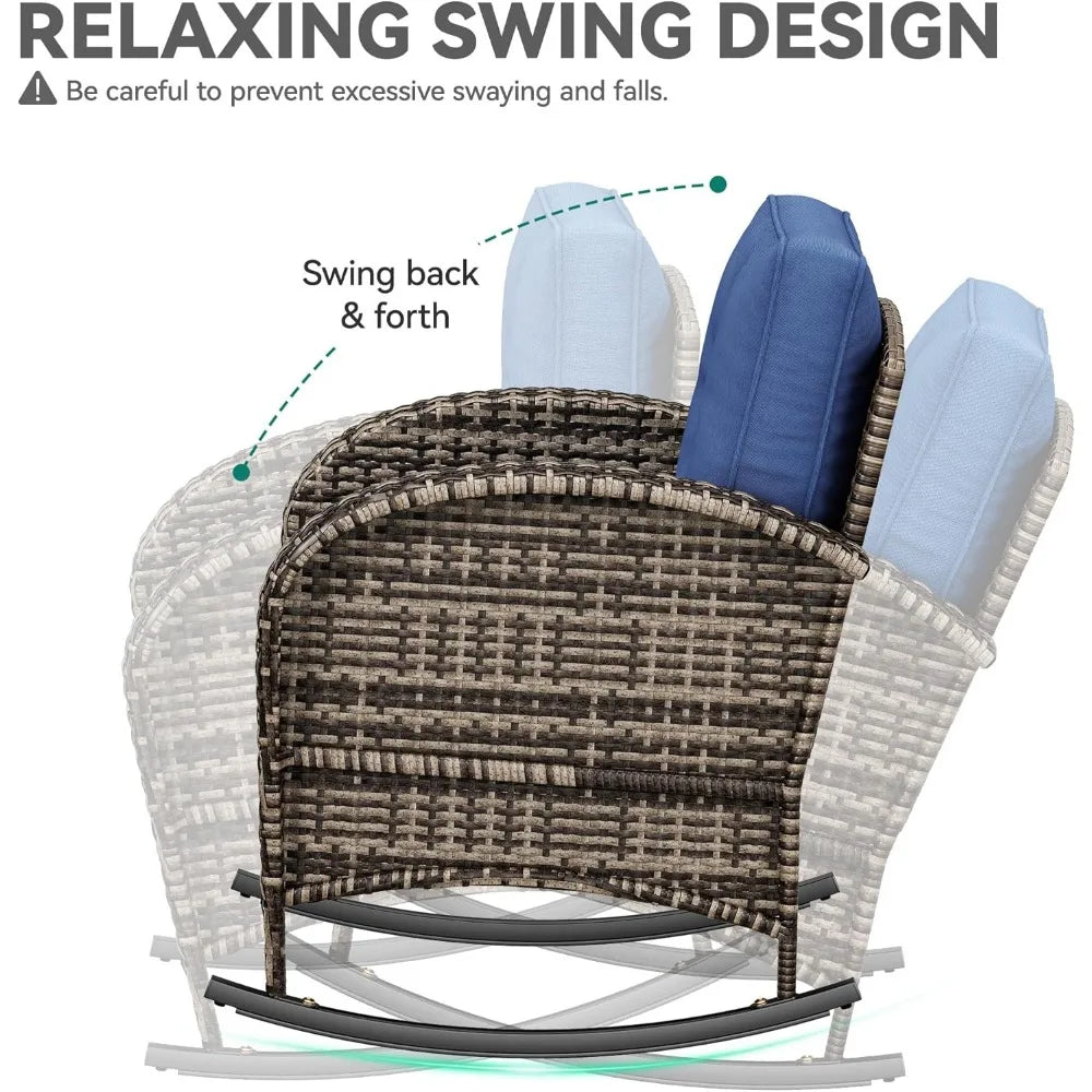 - Solid Materials: This wicker rocking chairs set consists of two chairs and a coffee table; The sturdy iron frame ensures durability and rust resistance; The durable PE rattan offers UV and water resistance, making it suitable for outdoor use