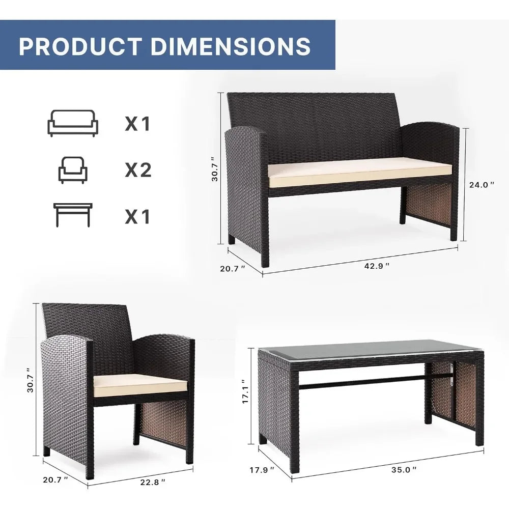 High Quality Materials: Made of high quality metal frame and tough PE rattan to ensure durability and weather resistance. 4-piece patio furniture set is designed for outdoor use with weather and UV protection Tilt High Back: The backrest of this outdoor furniture set is up to 31.7 inches high and has a slight tilt angle, more ergonomic design, providing superior comfort and support, making this outdoor furniture perfect for relaxing in the garden or on the balcony Humanized Design:The table top of this wicker patio set is made of tempered glass, easy to clean and maintain, and equipped with non-slip suction cups for enhanced stability. In addition, the sofa cushions are designed with zippers for easy removal and cleaning Simple Installation:Our patio furniture includes a double sofa, two single sofas and a coffee table with tempered glass table top. We provide easy-to-follow instructions and all the necessary hardware to ensure your smooth assembly Our Promise: Our Patio Conversation Set is shipped in one box.If you have any problems, such as missing accessories or damage, please feel free to contact us, we will reply you within 24 hours to solve your problem High Quality Materials: Made of high quality metal frame and tough PE rattan to ensure durability and weather resistance. 4-piece patio furniture set is designed for outdoor use with weather and UV protection Tilt High Back: The backrest of this outdoor furniture set is up to 31.7 inches high and has a slight tilt angle, more ergonomic design, providing superior comfort and support, making this outdoor furniture perfect for relaxing in the garden or on the balcony Humanized Design:The table top of this wicker patio set is made of tempered glass, easy to clean and maintain, and equipped with non-slip suction cups for enhanced stability. In addition, the sofa cushions are designed with zippers for easy removal and cleaning Simple Installation:Our patio furniture includes a double sofa, two single sofas and a coffee table with tempered glass table top. We provide easy-to-follow instructions and all the necessary hardware to ensure your smooth assembly Our Promise: Our Patio Conversation Set is shipped in one box.If you have any problems, such as missing accessories or damage, please feel free to contact us, we will reply you within 24 hours to solve your problem