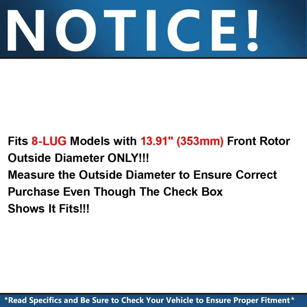 With a fitment measurement of 13.91 inches (353mm), this brake kit is tailored to provide a seamless installation for 8 Lug Extended Crew Cab Models, whether in 2WD or 4WD configurations. Enjoy the confidence that comes with improved braking performance and reliability on the road.