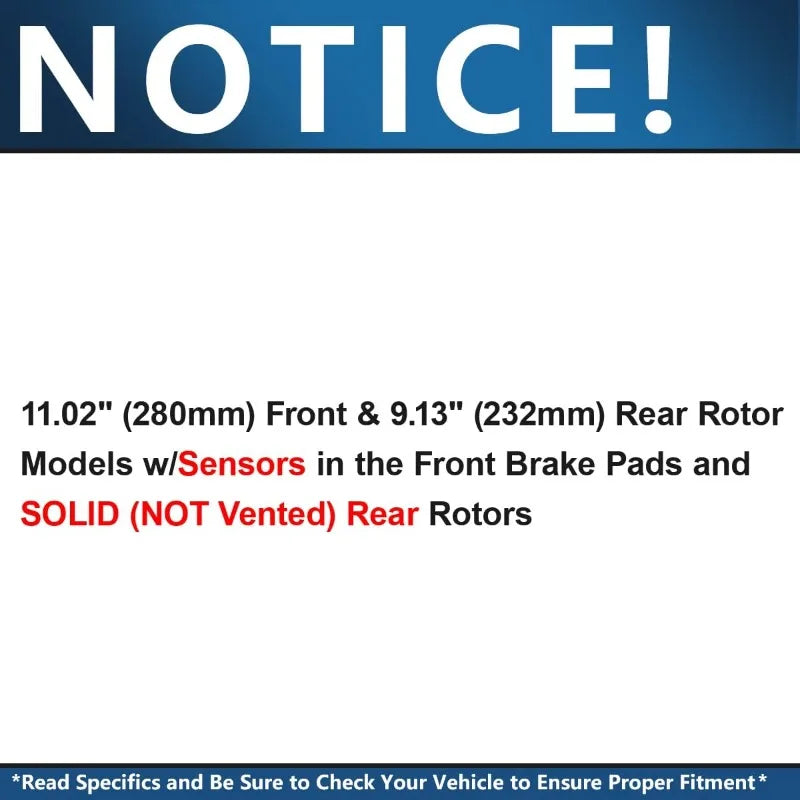 Upgrade your vehicle's braking performance with the Detroit Axle Brake Kit with Slotted Disc Rotors and Ceramic Brake Pads. This premium brake kit is designed specifically for models featuring 11.02" (280mm) front rotors and 9.13" (232mm) rear rotors, ensuring a perfect fit and optimal function. Ideal for vehicles equipped with sensors in the front brake pads and solid (not vented) rear rotors, this kit guarantees a seamless installation and enhanced safety on the road.