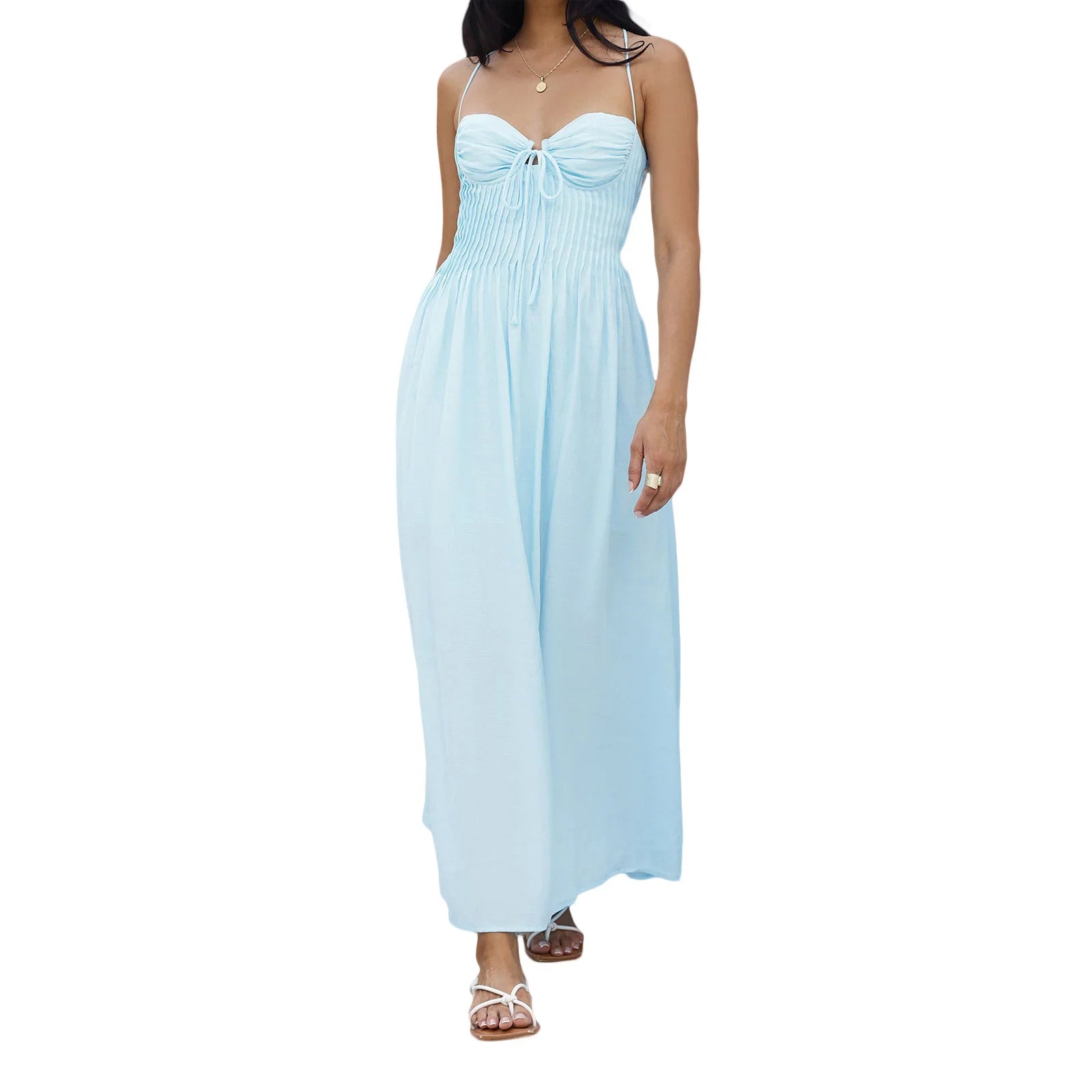 Womens Pleated Long Dress Summer Sleeveless Spaghetti Strap Tie-up Front Dress Flowy Beach DressFeatures: