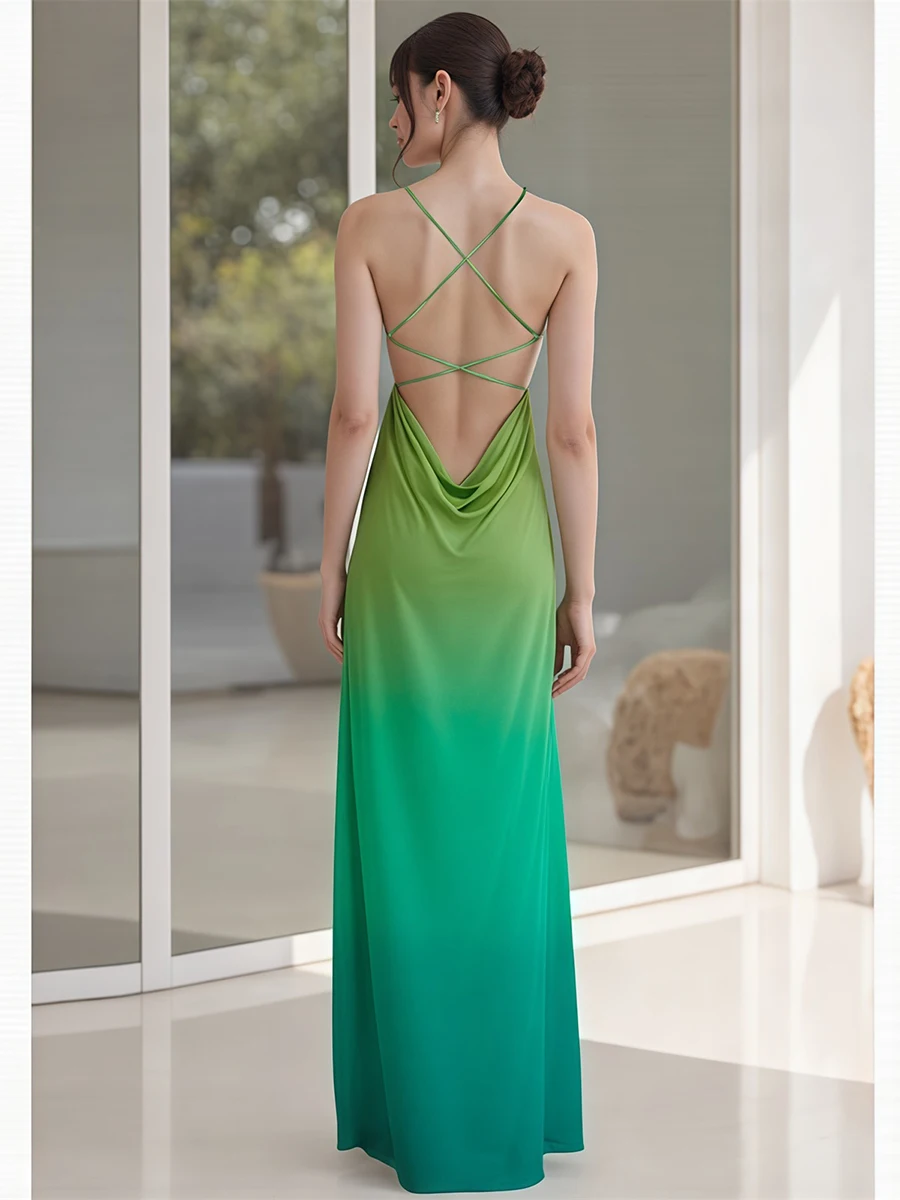 Women's Halter Dress Loose Hem Stylish Gradient Sleeveless Long Dress for Spring& SummerSize (cm)