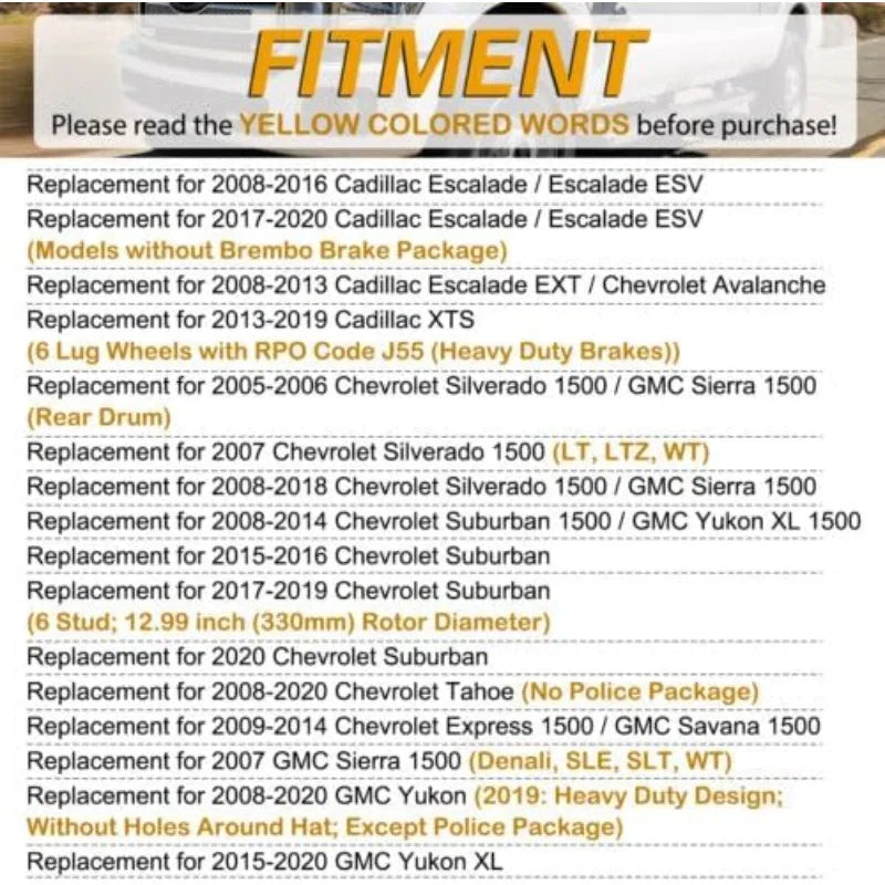 Upgrade your Chevy Silverado or Suburban with our Front Disc Brake Pads and Rotors Kit, specifically designed for optimal performance in heavy-duty applications. This comprehensive kit includes high-quality carbon-fiber ceramic brake pads and durable rotors, ideal for Chevy Silverado 1500, GMC Yukon, Sierra, and Cadillac Escalade models. Experience enhanced stopping power and longevity that ensures you feel safe and confident on the road.