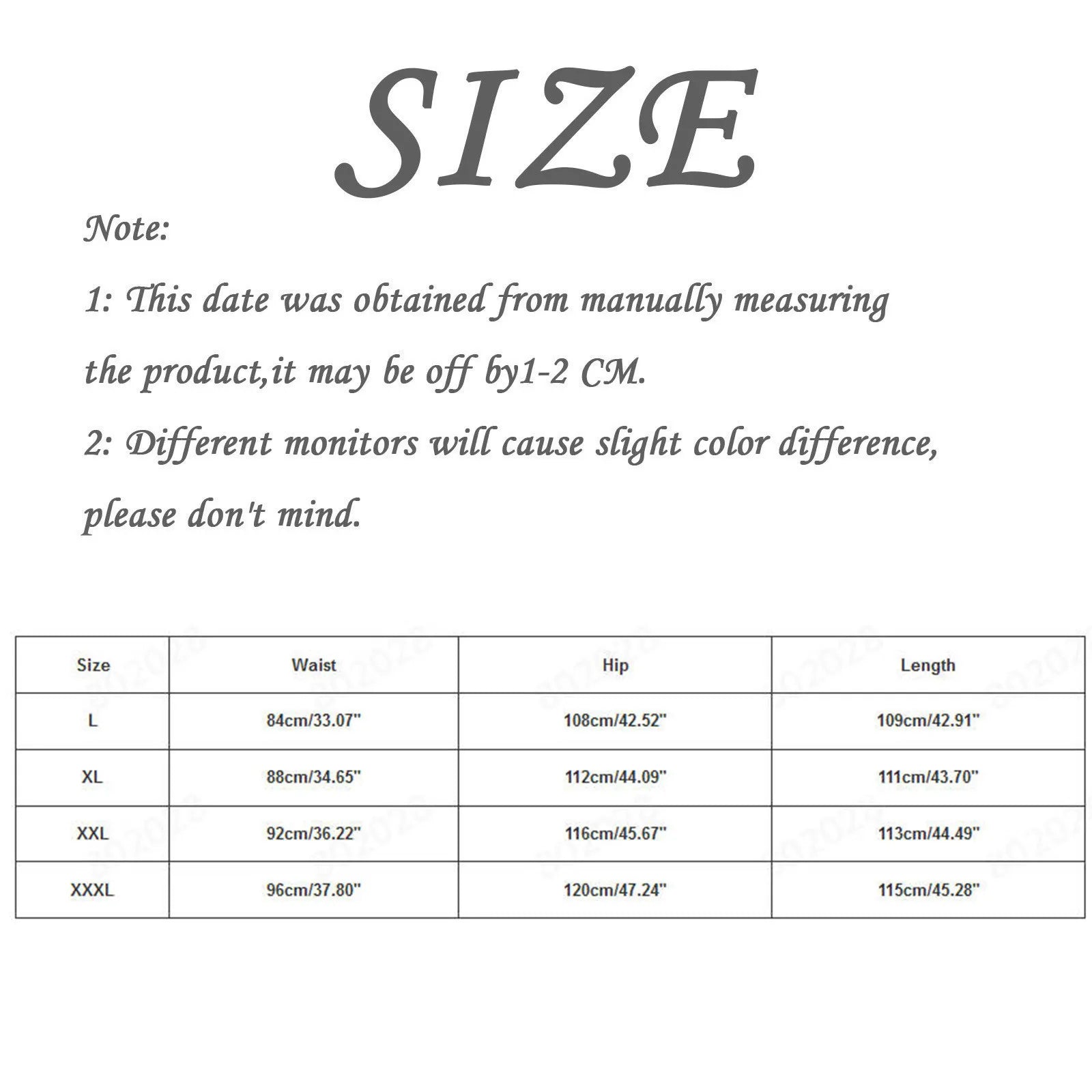 | Size:L | Waist:84cm/33.07'' | Hip:108cm/42.52'' | Length:109cm/42.91'' |
