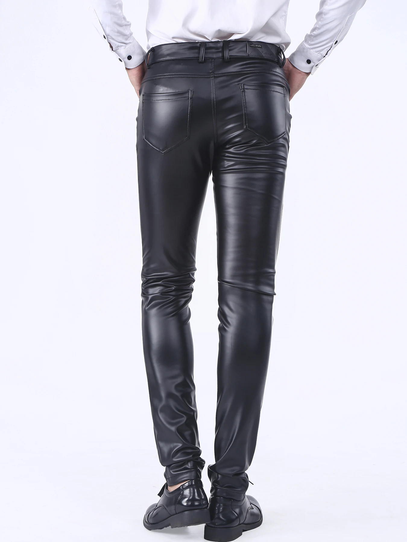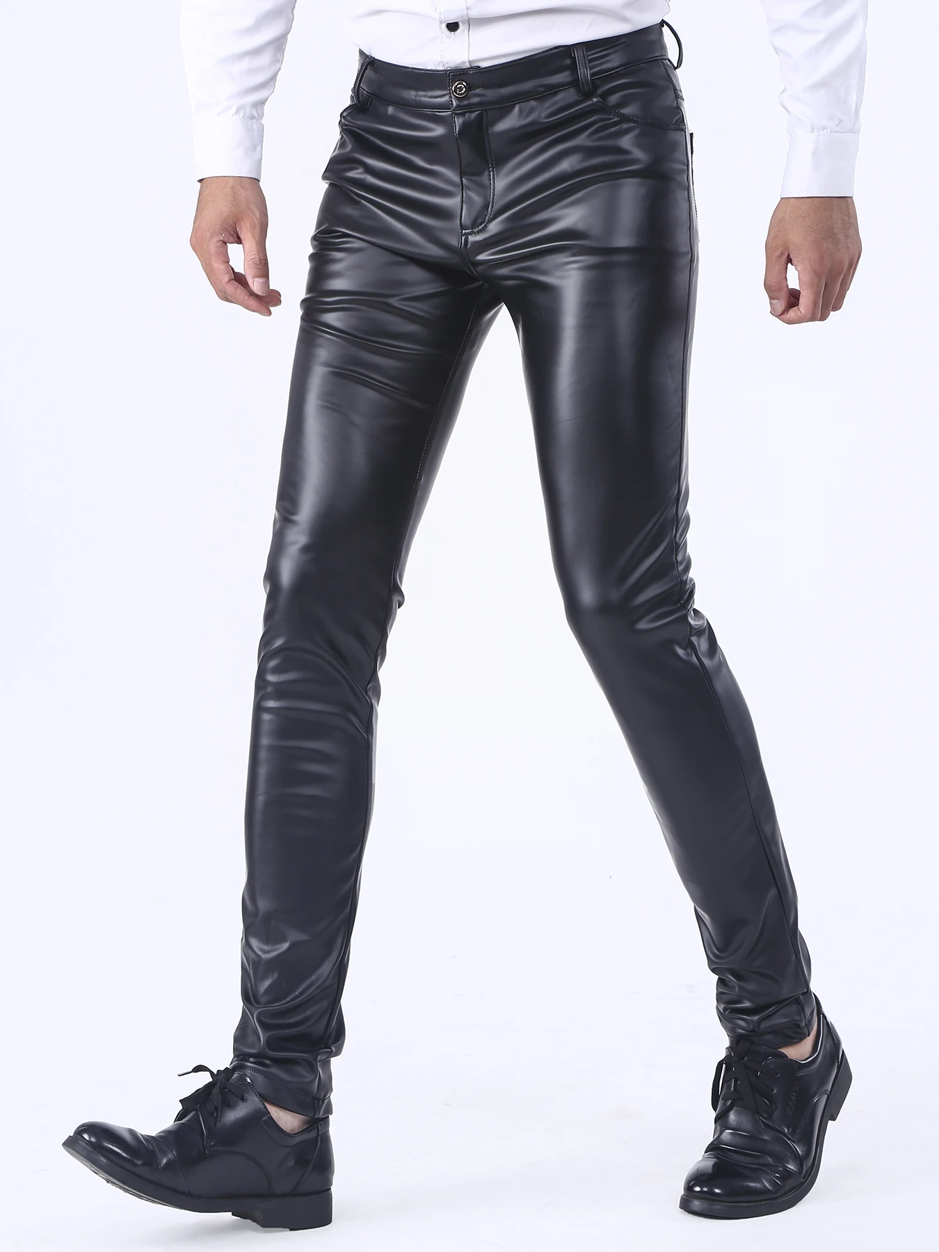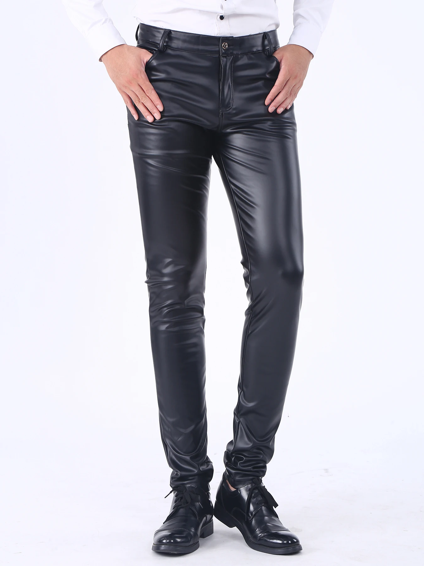 Men`s Party Stage Performance Business Slim Fit Five Pockets Faux Leather Pants Jeans