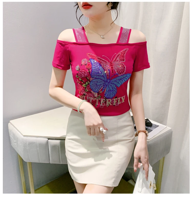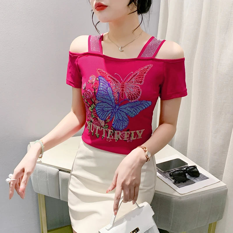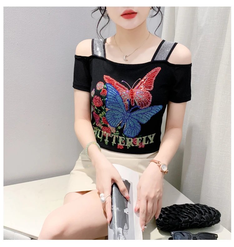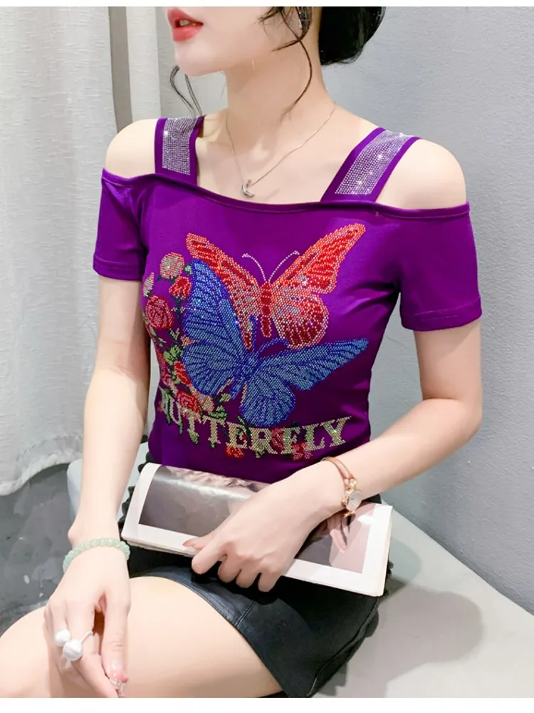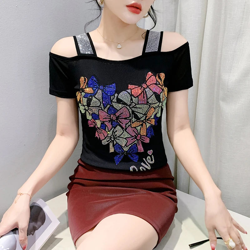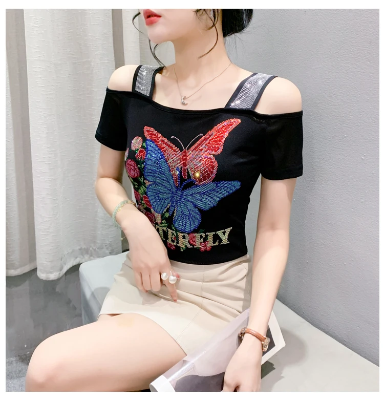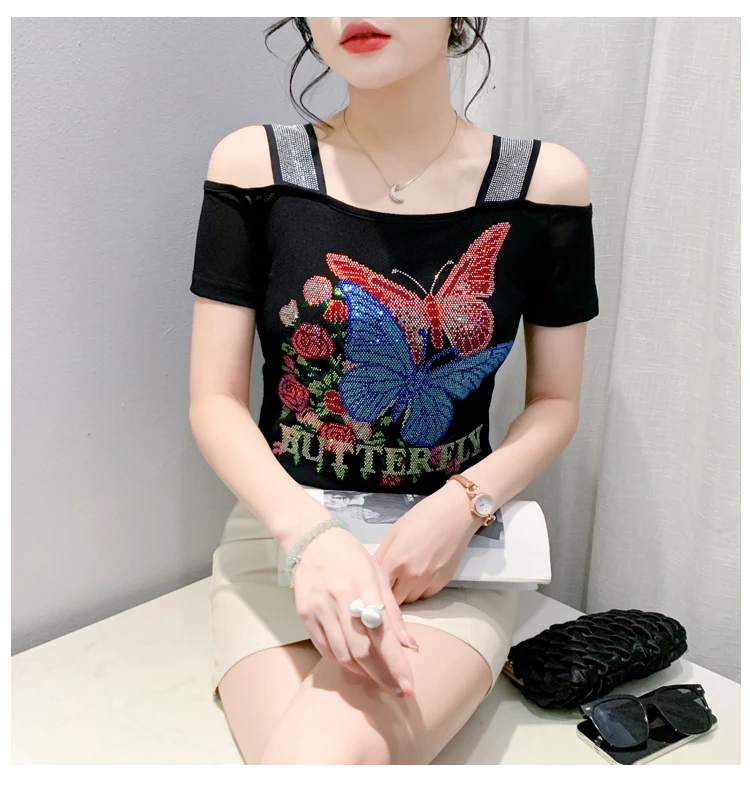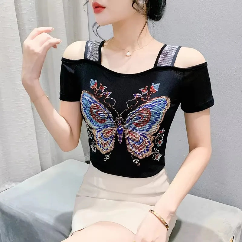 New Ladies Clothes Butterfly Letter Design T-Shirt Sexy Off Shoulder Shiny Diamonds Women Chic Mesh Tops Tees Shirts