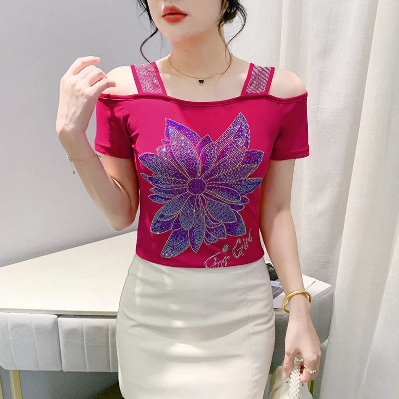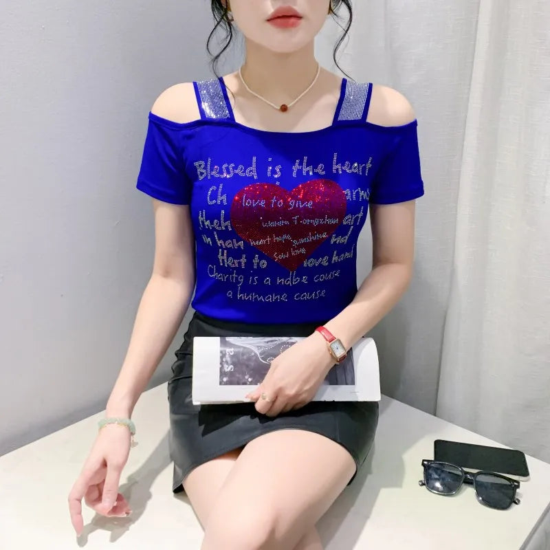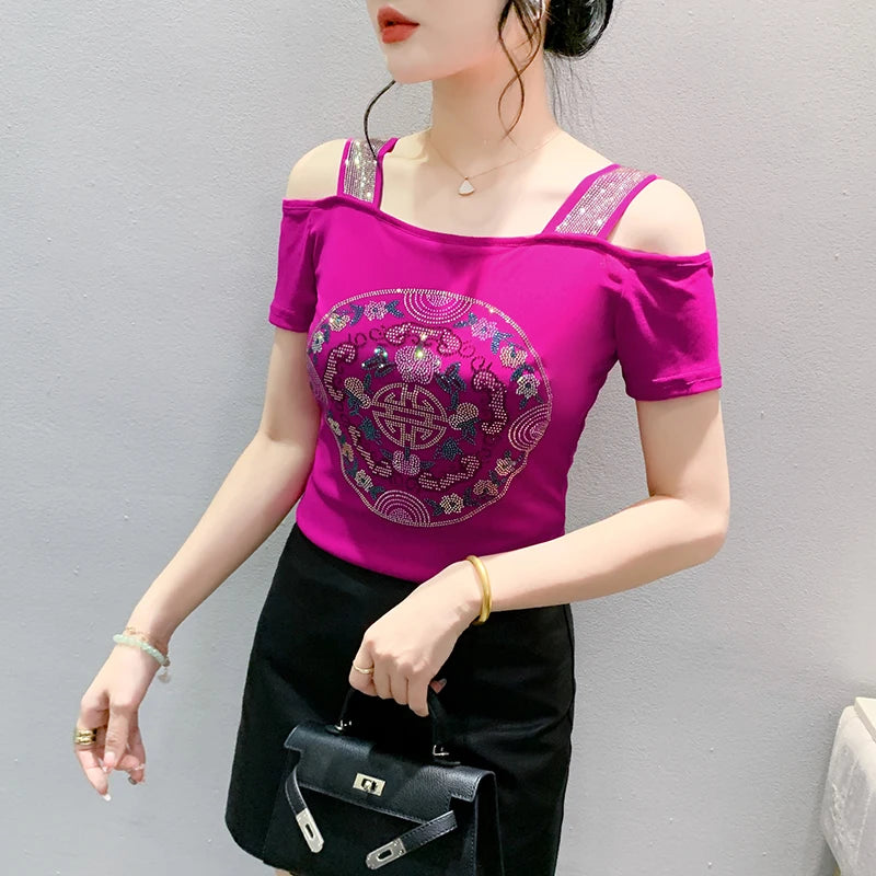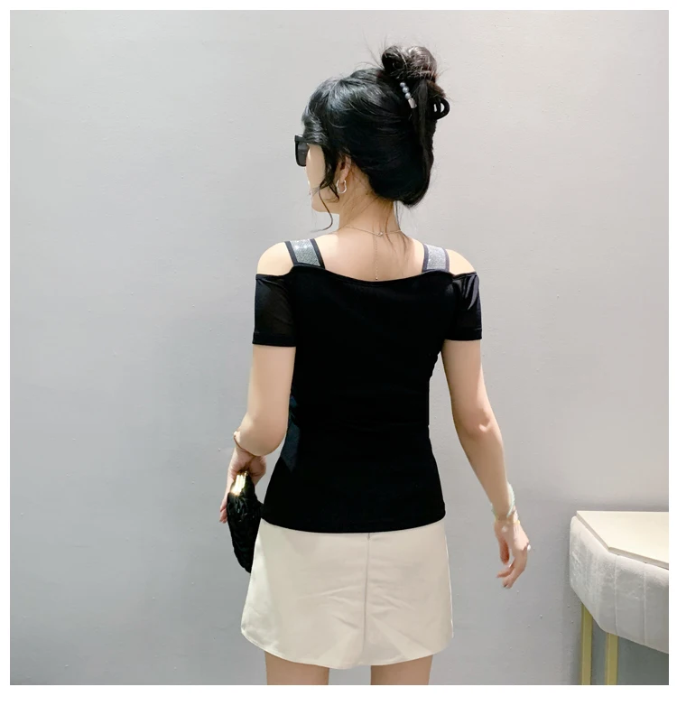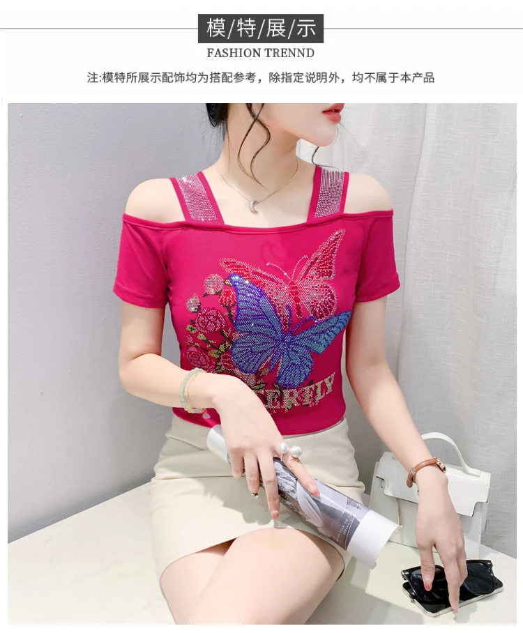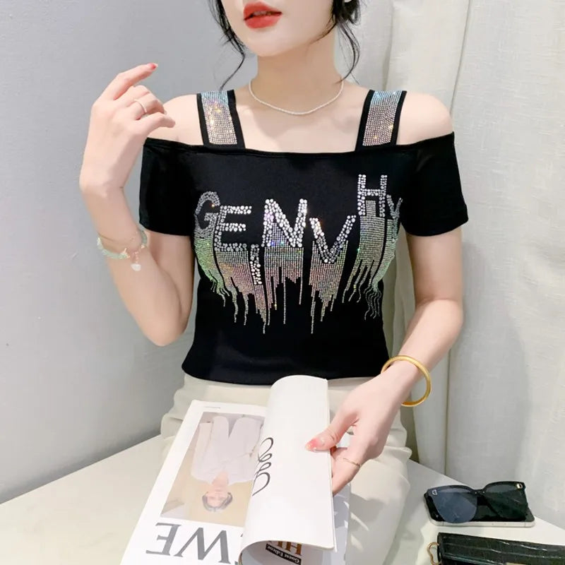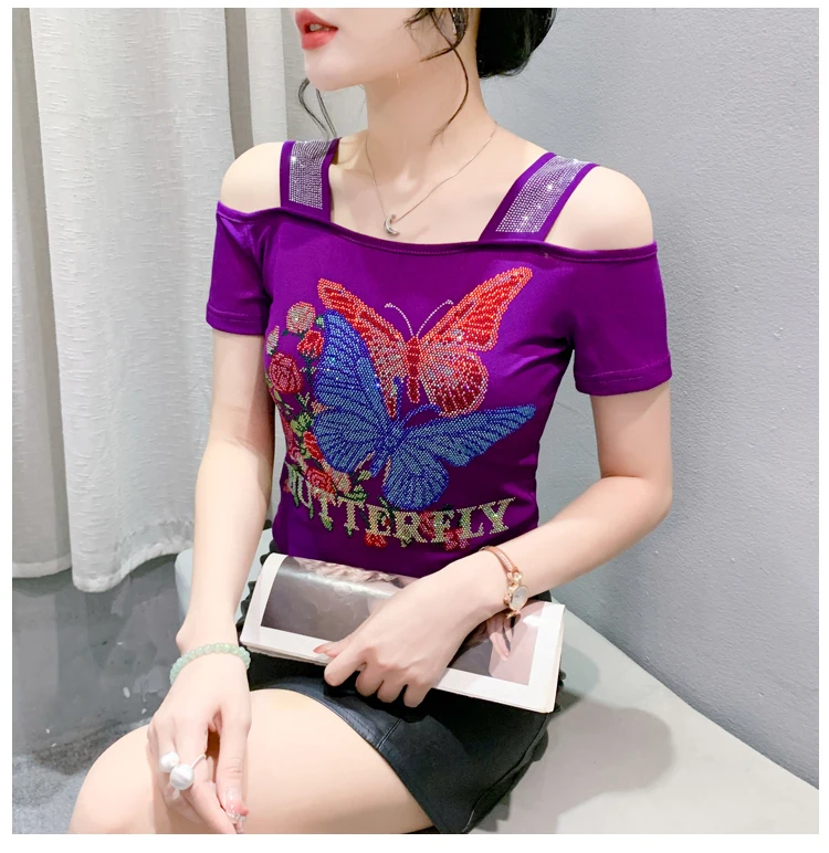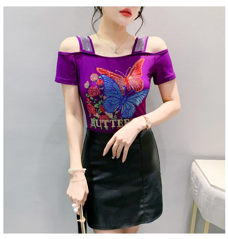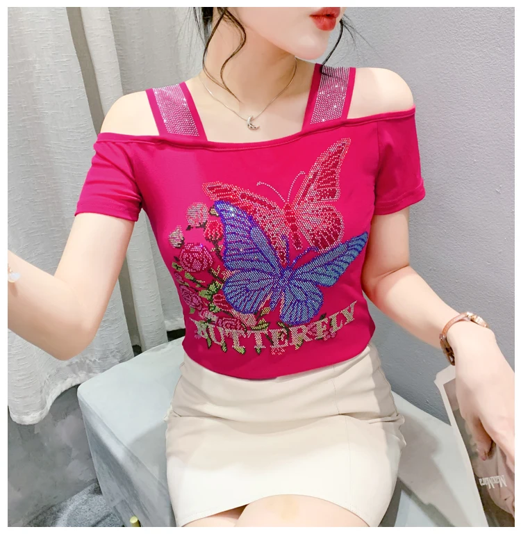 New Ladies Clothes Butterfly Letter Design T-Shirt Sexy Off Shoulder Shiny Diamonds Women Chic Mesh Tops Tees Shirts