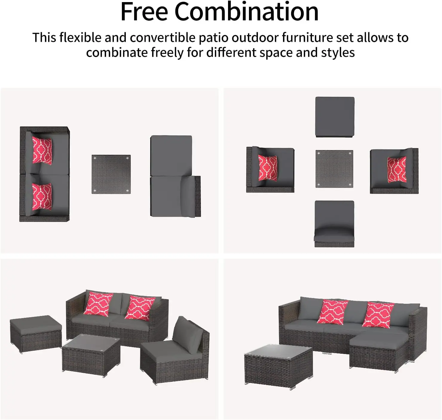- Sectional Patio Furniture: This patio furniture set is adaptable and movable. There are at least 4 different combinations to meet your different needs and space