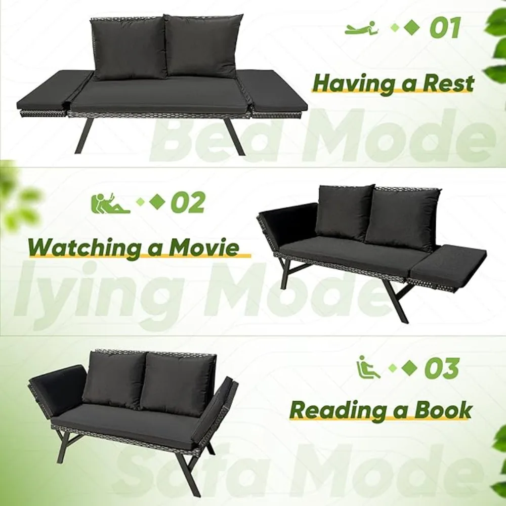 Outdoor Sofa with Adjustable Armrests, Convertible Daybed or Double Chair, Woven Rattan Patio Furniture, Outdoor Sofa