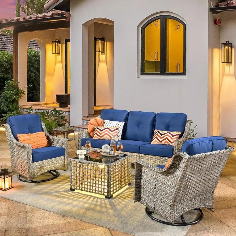 - 5 Pieces Patio Furniture Set: You Will Get: 1*3 Seat Sofa, 2*Swivel Chairs, 1*Coffee Table,1*Side Table