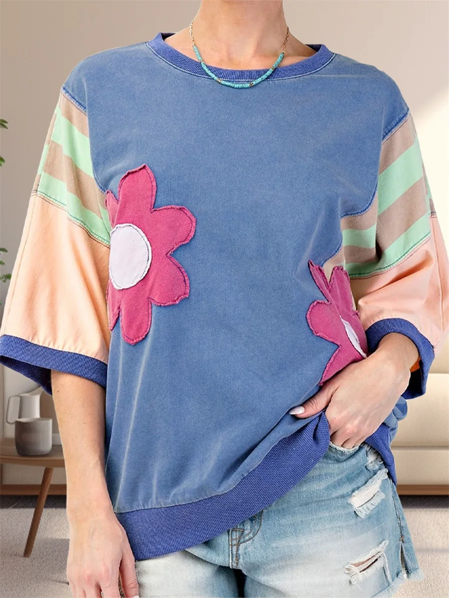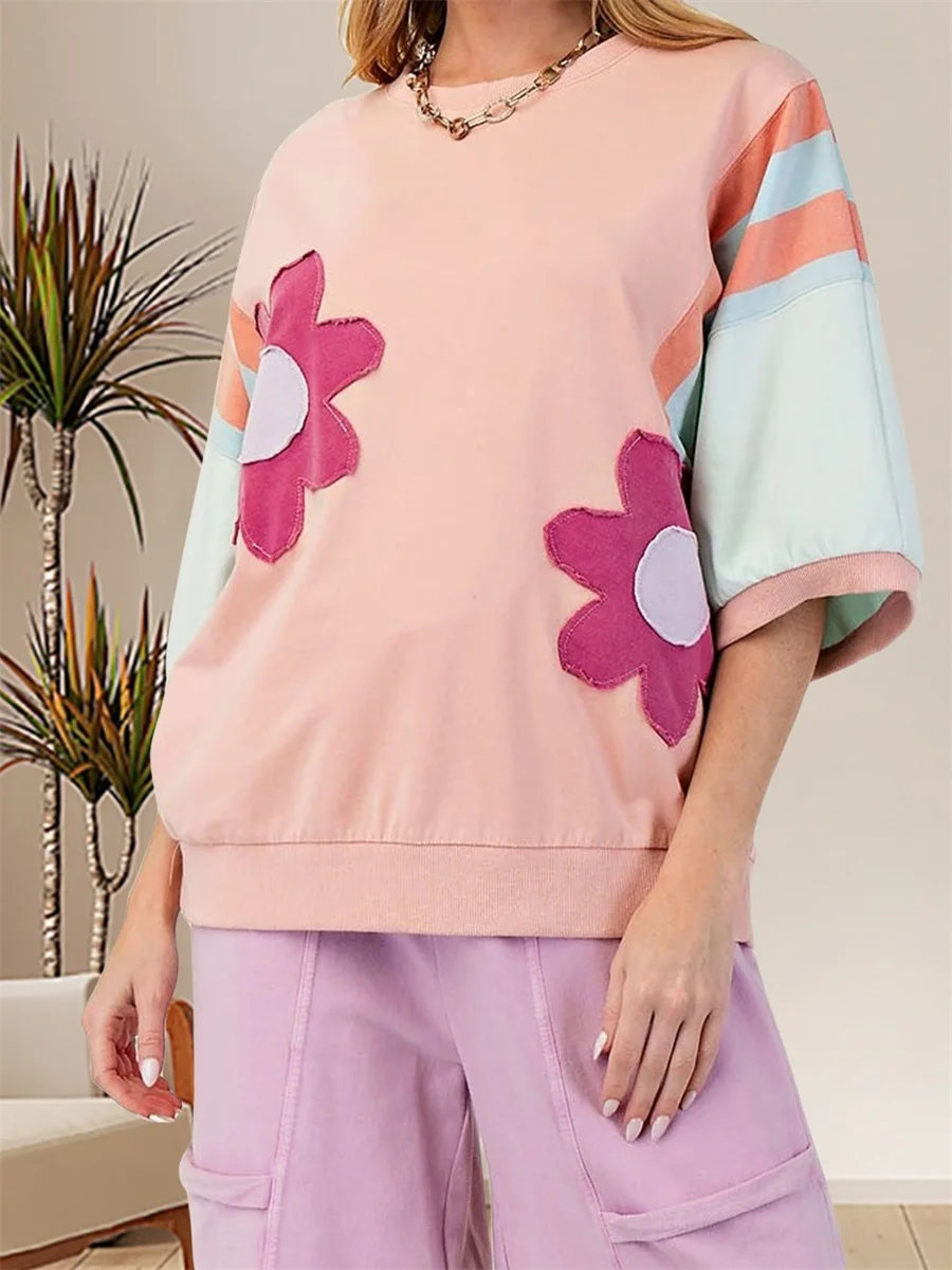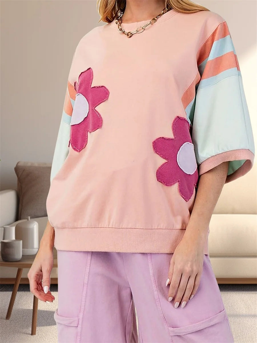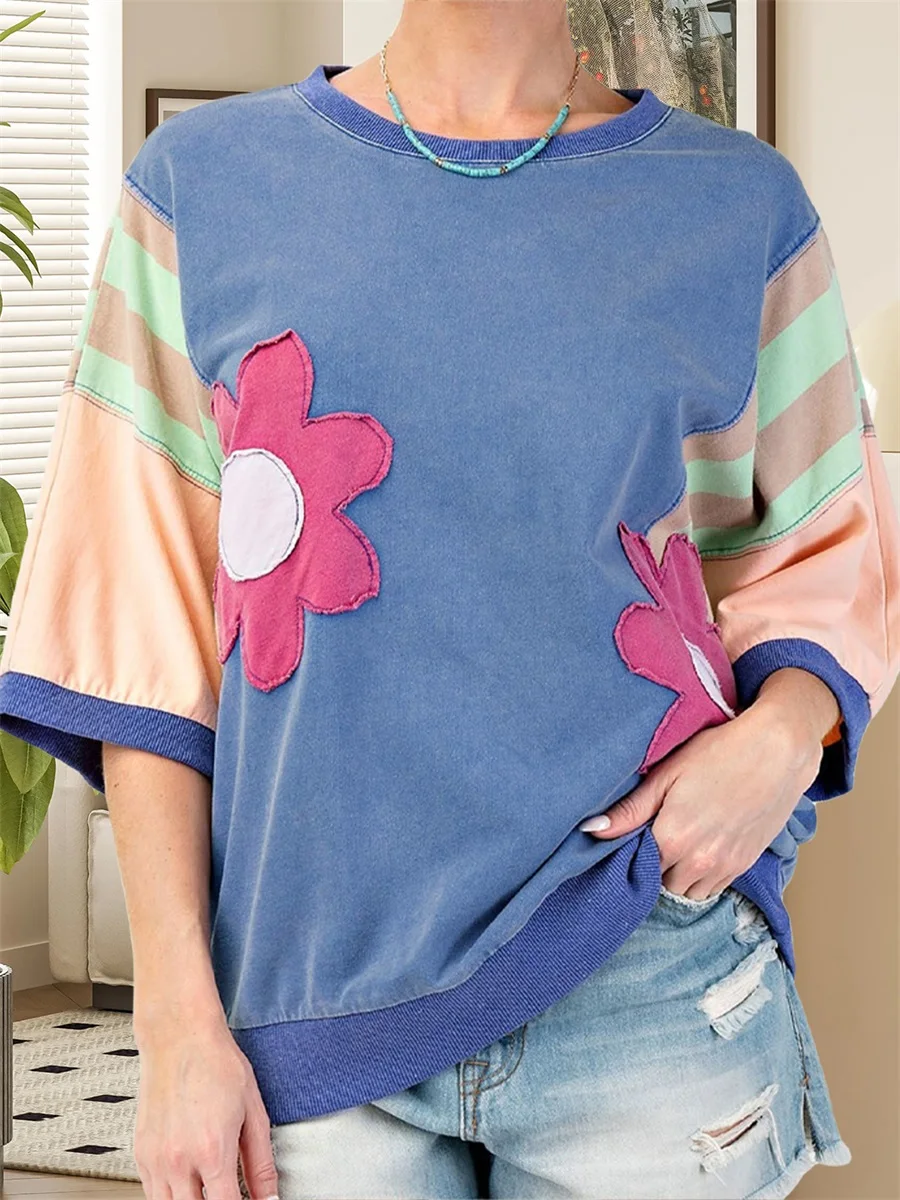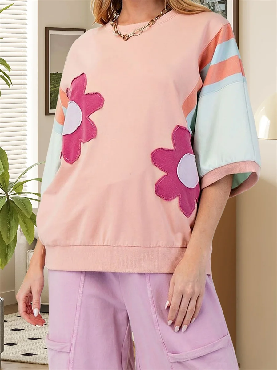 Women T-shirt, Crew Neck Short Sleeve Flower Contrast Color Summer Loose Tops for Casual DailySuper comfy and stylish which is what your closet is missing and is very popular among party. Easy to wash and dry with no wrinkles.